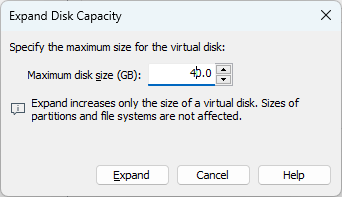 드디어 기다리던 Maximum disk size가 나옵니다. 여기서 다음과 같이 용량을 변경하면 Expand가 활성화됩니다.