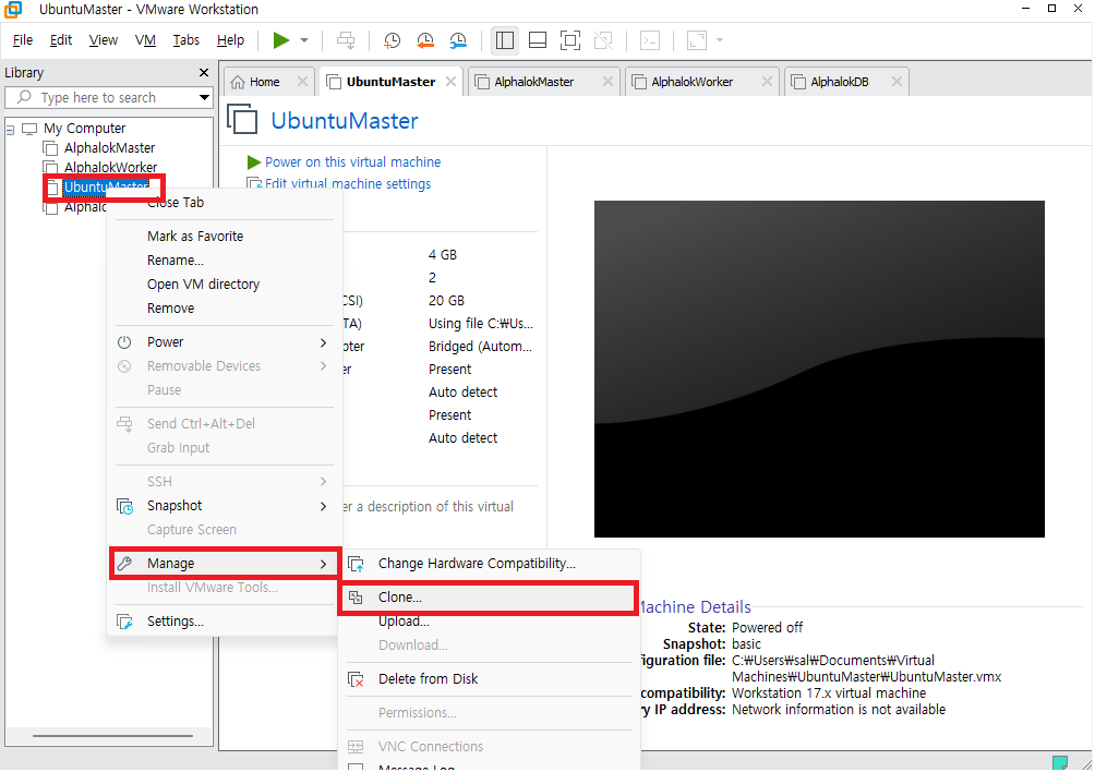 VMWare에서 확장하려는 VMWare 이미지를 선택한 후 오른쪽 클릭 > Manage > Clone을 선택합니다.